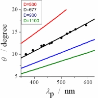 反射される光の波長と板の角度は、右の干渉条件によって関係付けられることが期待できます。この式にあらわれるパラメータを注意深く決定しました。