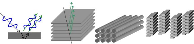 円柱の二次元配列(クジャク)、右端がモルフォチョウの鱗粉にある構造です。